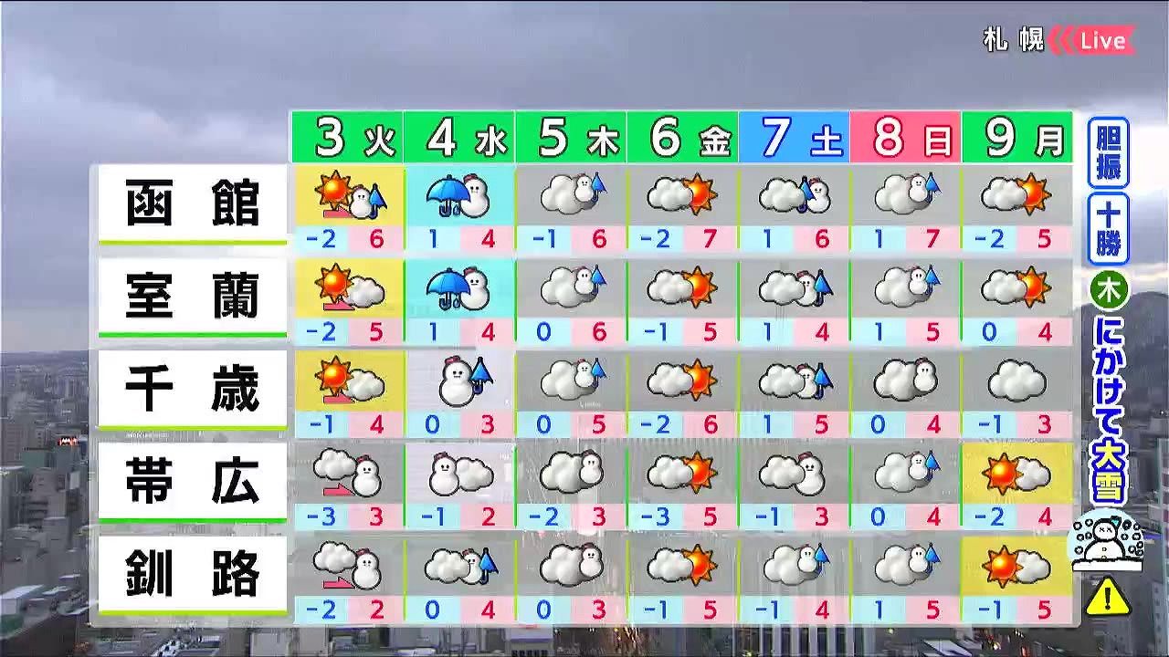 木曜にかけて雪や雨が降り、胆振の山沿いや十勝地方の多いところで30センチを超える大雪になるおそれがあります。また、水曜は千歳でも雪の強まる時間があるため、交通情報もご確認ください。土日も天気が崩れるでしょう。