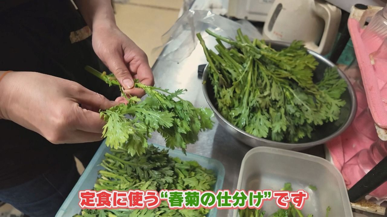 春菊は「定食用」と「かき揚げ用」の2種類に分けていきます。