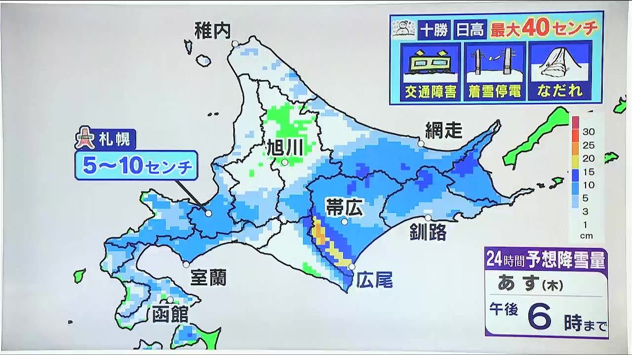 あす5日(木)午後6時までの24時間予想降雪量です。大雪になっている十勝南部や日高東部でさらに最大40センチの雪の降るおそれがあります。あす5日(木)にかけても交通障害や着雪による停電、傾斜地でのなだれにも注意して下さい。札幌は山沿いを中心に5~10センチでしょう。
