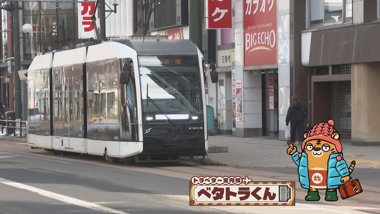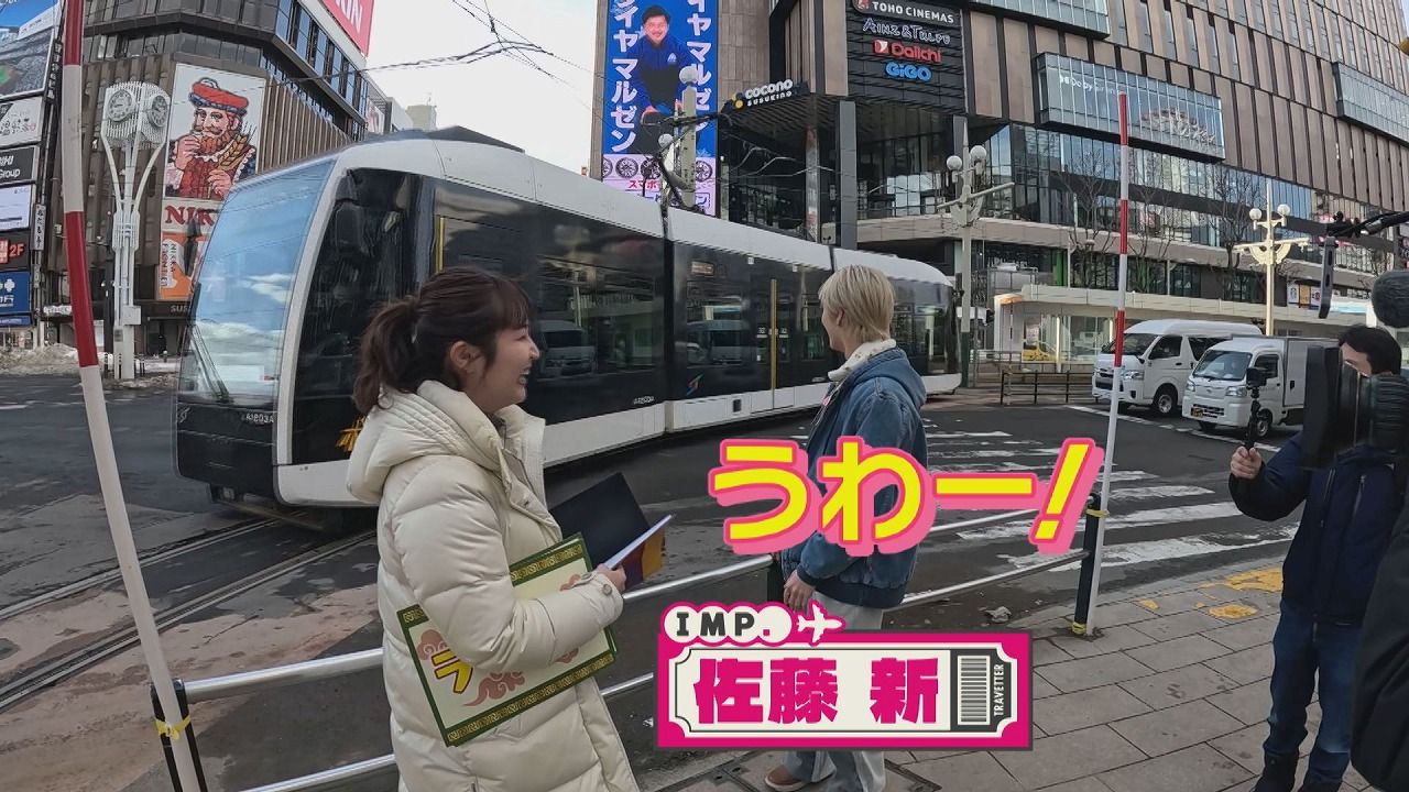 松尾アナ:「路面電車も走っております」新くん:「こんな間近で通った、びっくり」