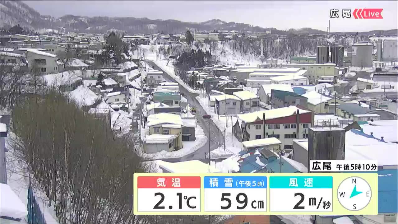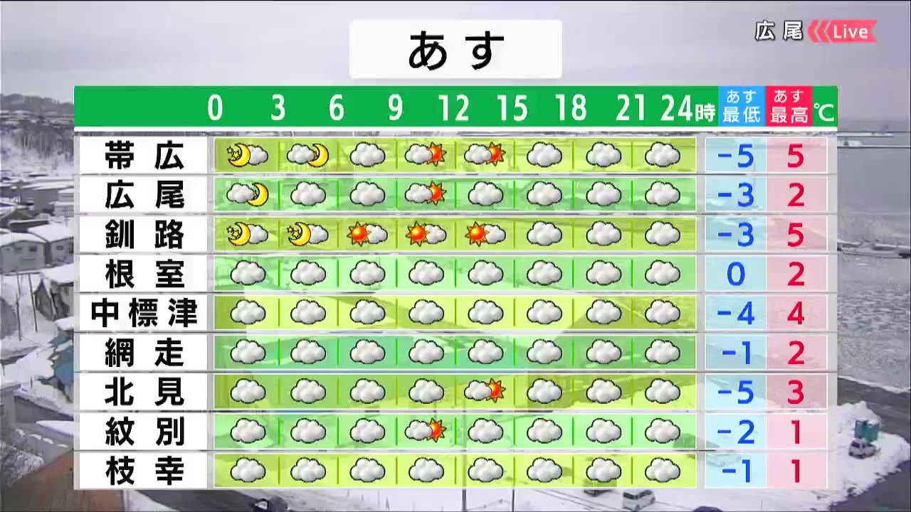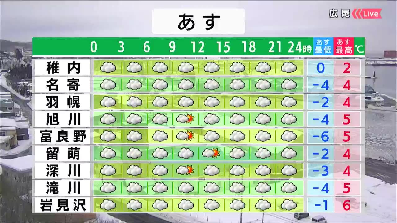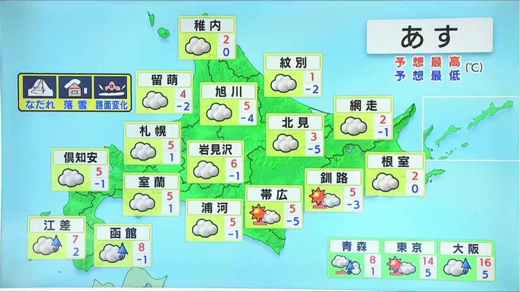 十勝や釧路地方で昼頃まで晴れ間がある他は、広く曇るでしょう。最高気温は各地プラスで広尾は2度です。引き続き、落雪や泥はねに注意が必要です。