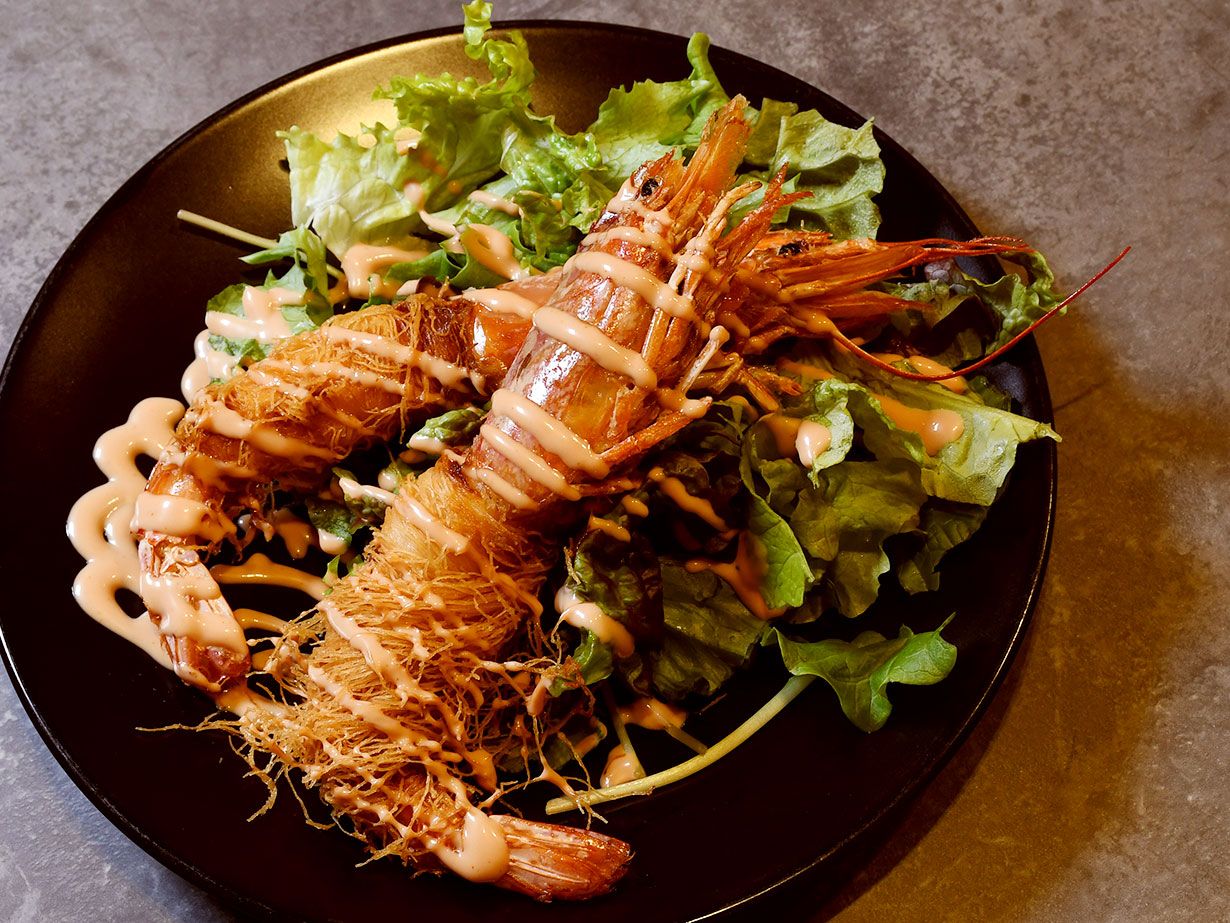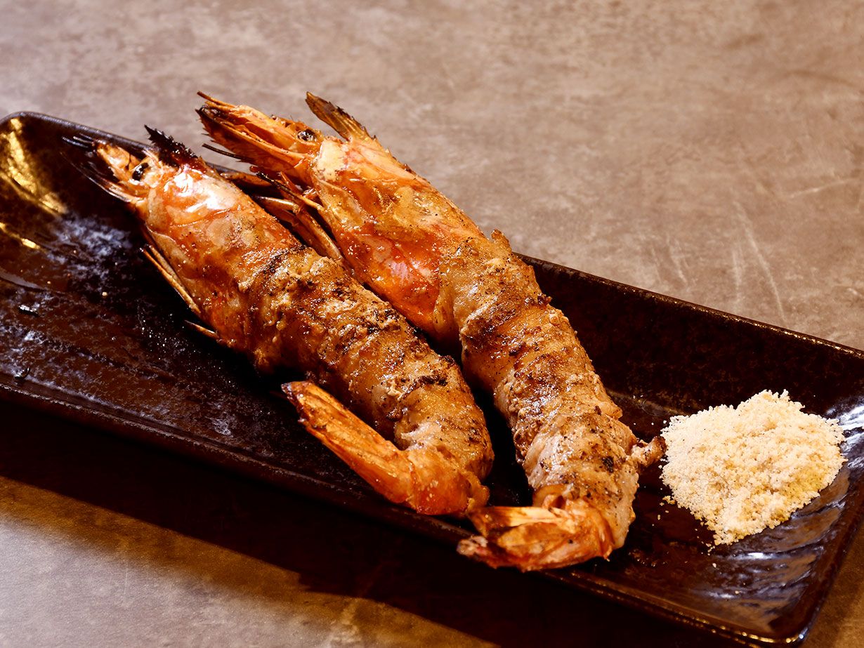 殻をむいた肉厚なエビに豚バラ肉を巻きつけて、炭火でじっくり焼き上げています。