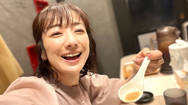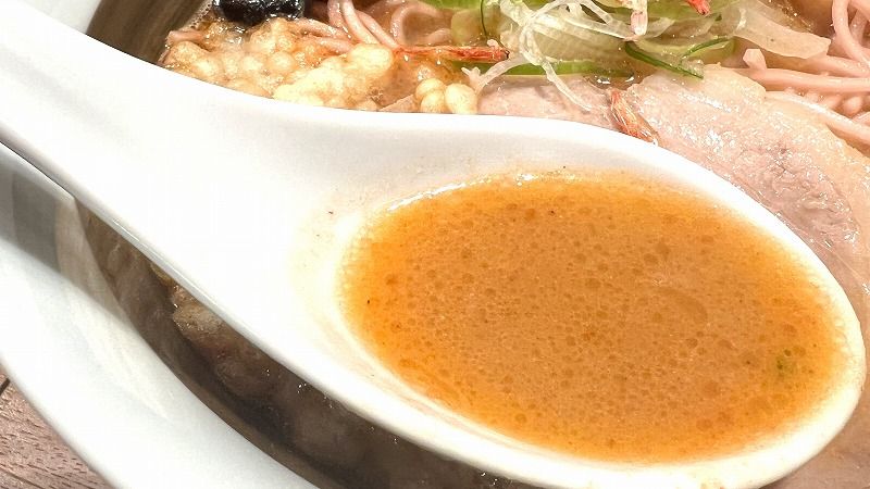 店内に入ってすぐにエビの香りを感じて、焼売でぷりっと食感も楽しんで、そして、ラーメンのスープをレンゲですくって、口元へ近づけると…