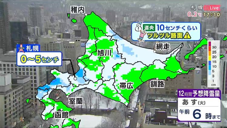 これから、あす午前6時までの12時間予想降雪量です。道央やオホーツク海側を中心に雪が降り、青色の石狩市周辺や後志西部で10センチくらいでしょう。大雪にはなりませんがあす朝もツルツル路面に注意して下さい。