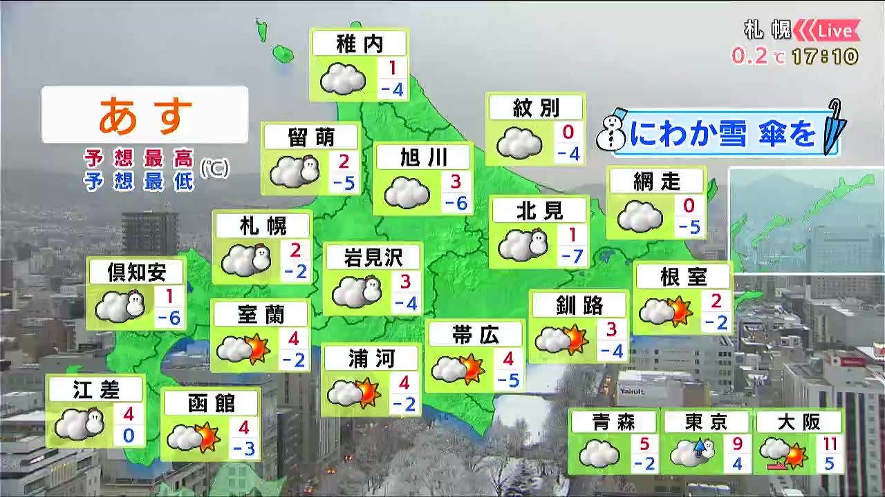 札幌や小樽は湿った雪が降るため、傘があると安心です。函館周辺も昼頃は雪が降るでしょう。雪の量は少ないですが、一時的に降り方が強まりそうです。