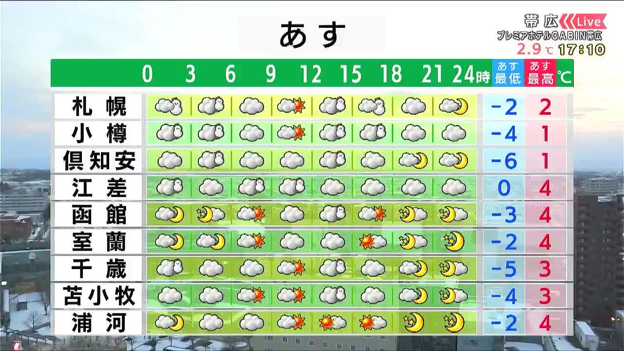 あすの時間ごとの天気。道央・道南からです。