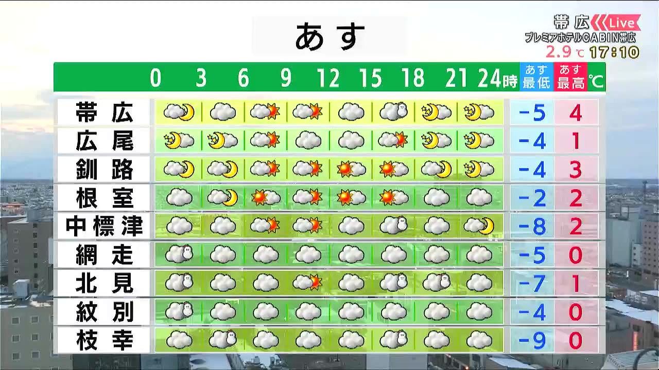 道東を中心に晴れ間があるでしょう。午後は大気の状態がやや不安定になり帯広や北見など内陸や山沿いの一部で雪が降りそうです。