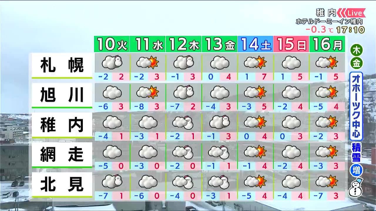 日差しが少なく、木曜から金曜はオホーツク海側を中心に雪の量が多くなるでしょう。気温は金曜まで平年並みか低くオホーツク海側は日中も0度くらいです。
