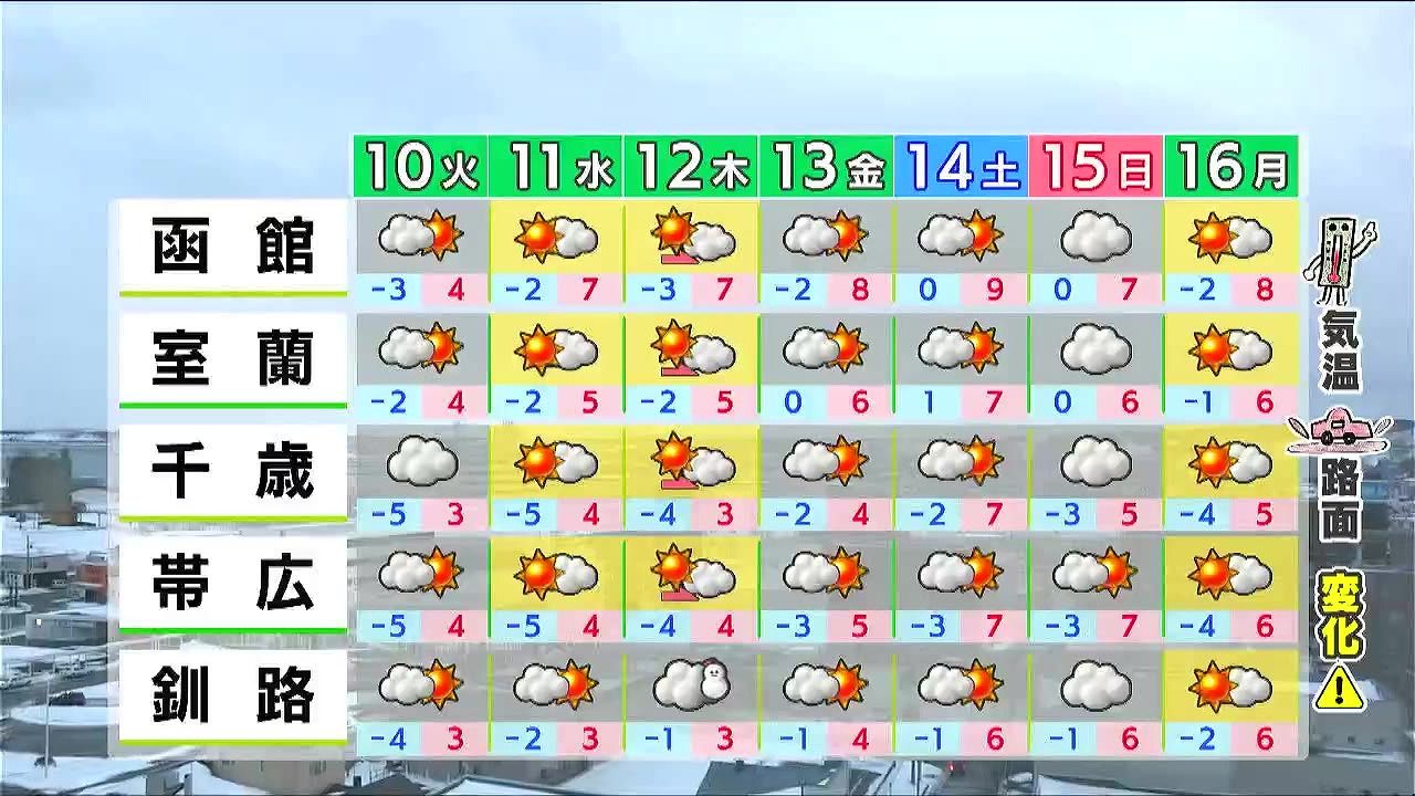 晴れ間の出る日が多いですが、木曜の午後は釧路方面で雪が降るでしょう。気温や路面状況の変化に注意して下さい。週末は各地で気温が5度を超えるでしょう。