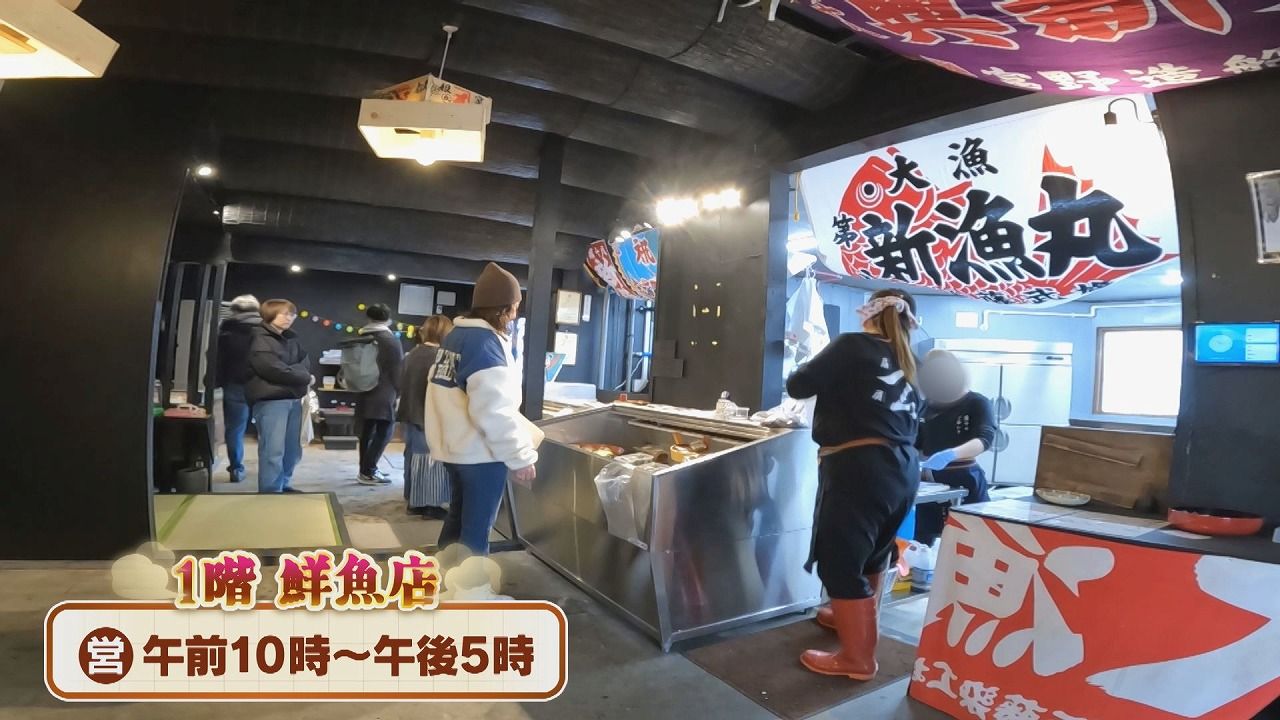 1階は新鮮な魚が並ぶ鮮魚店で、2階では干物定食を楽しむことができます。