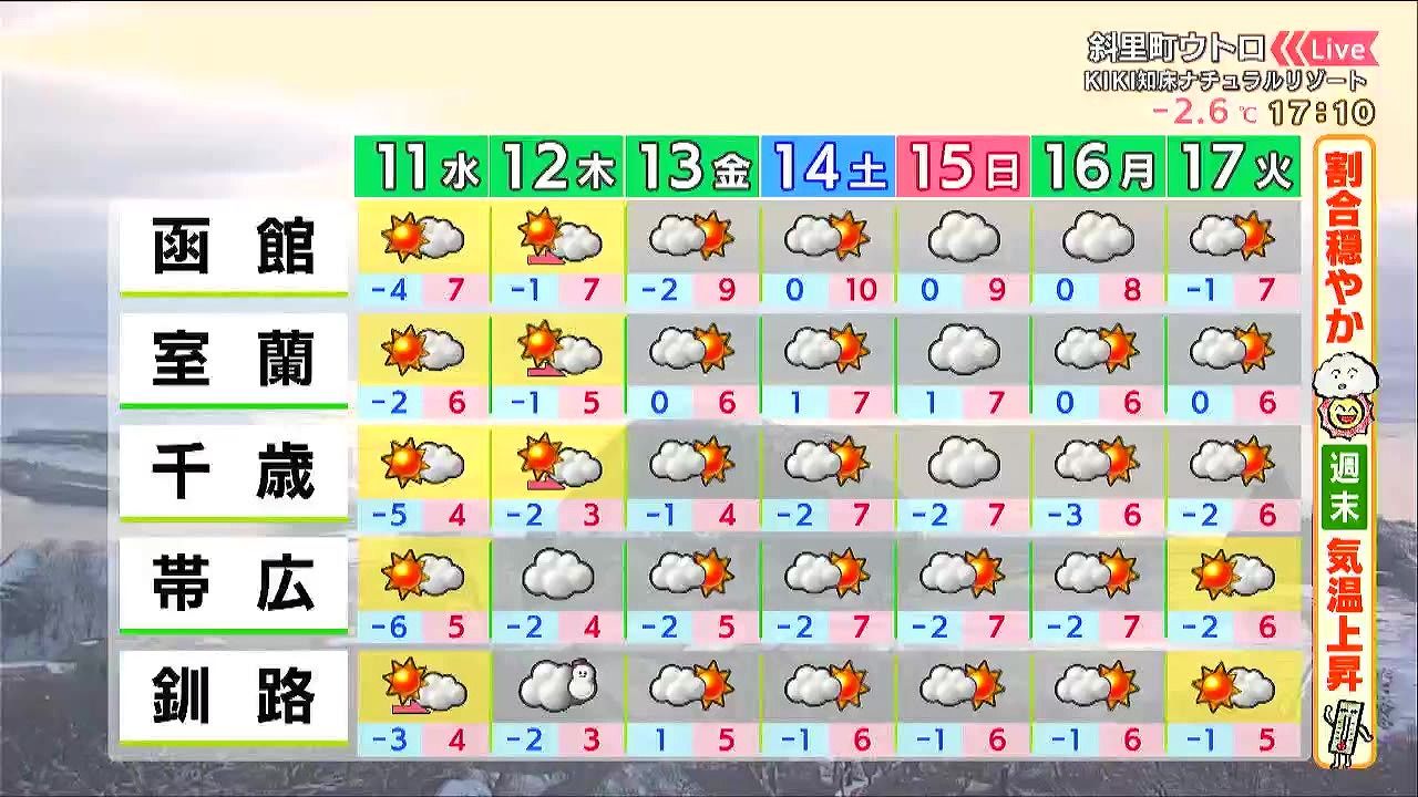 割合穏やかですが、木曜は釧路や根室地方を中心に風が強まり、5センチ前後の雪が降りそうです。週末は気温が上がり、土曜の函館の最高気温は4月上旬並みの10度です。