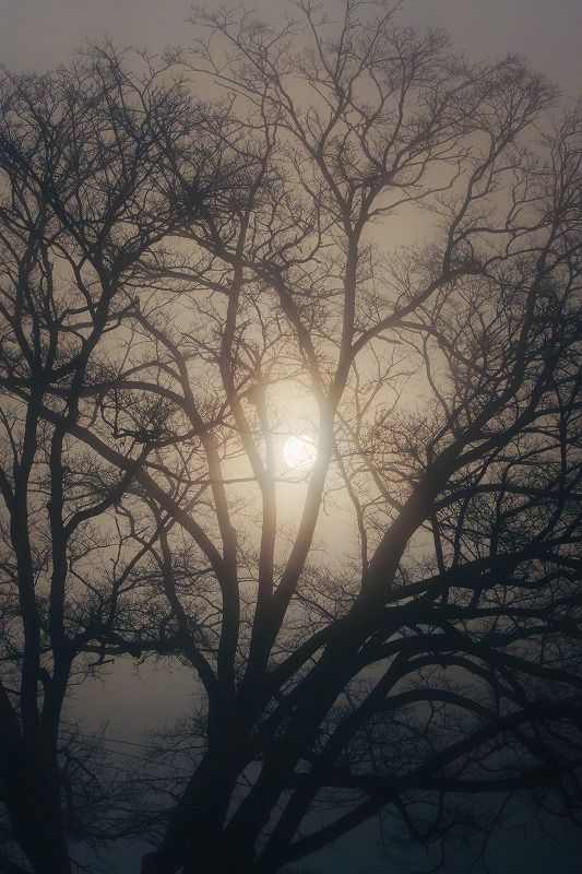 太陽が背景に添えられて、枝1本1本がシルエットになっています。
