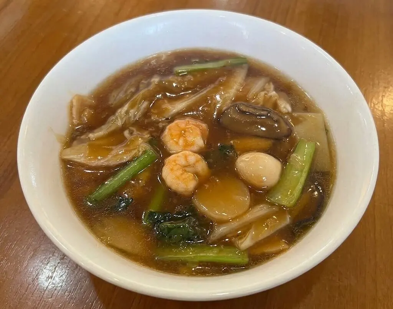 エビやイカ、豚肉に野菜と、豪華な具材がとろみのある餡に絡まり、最後まで熱々で楽しめます。
