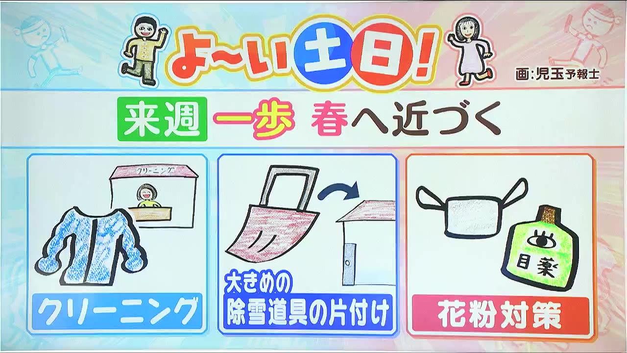 少しずつ冬服をクリーニングに出しても良さそうです。オホーツク海側は土日も雪かきが必要ですが、その他の地域はスノーダンプなど大きめの除雪道具を片付けても良さそうです。全部しまわないでくださいね。札幌や函館ではハンノキ花粉が観測されています。花粉症の方は、マスクや目薬など花粉対策グッズも用意しましょう。