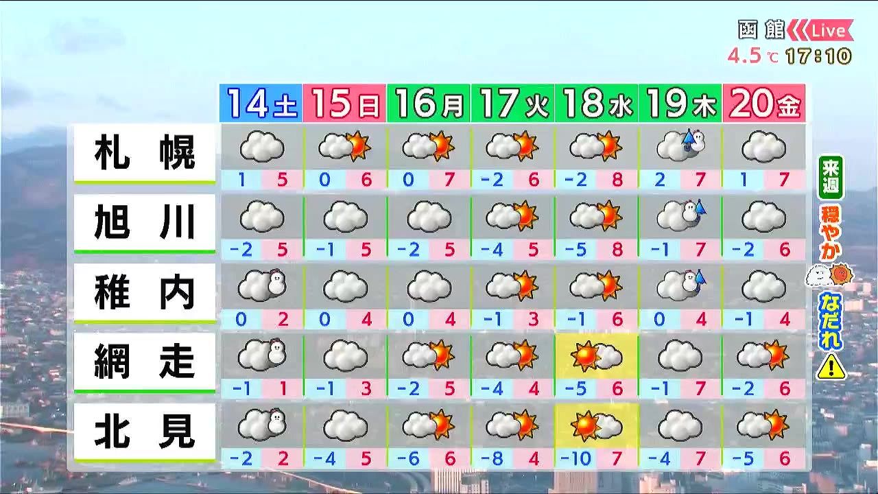 すっきり晴れる日は少ないですが、天気の大きな崩れもなく、割合穏やかです。最高気温は札幌で連日5度以上、オホーツク海側も日曜は寒さが緩みますが、なだれなどに注意して下さい。