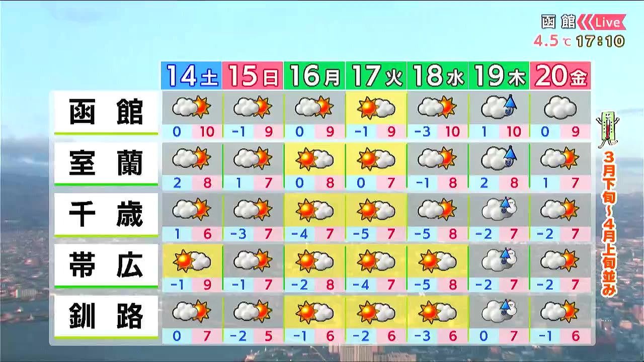 晴れる日が多いでしょう。気温は3月下旬から4月上旬並みで、函館は連日10度くらい。季節先取りの陽気が続きます。積雪ゼロの街が増えていくでしょう。