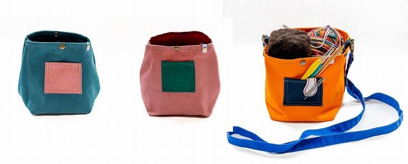 髙橋さんが企画し、雑貨店『SUQ+』が制作したオリジナルのモバ編みバッグ。外出先で編み物をする際に編みかけの作品と毛糸、道具が収まるように設計。