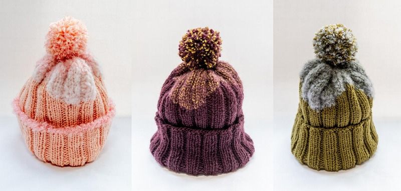 ニット帽各種。全体のフォルムと色合いはカップケーキをイメージ。