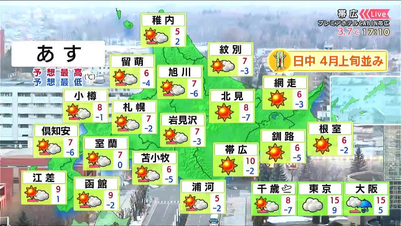各地で晴れて、最高気温は4月上旬並みです。帯広は10度まで上がるでしょう。積雪が多く残るオホーツク海側では、路面状況の変化に注意して下さい。