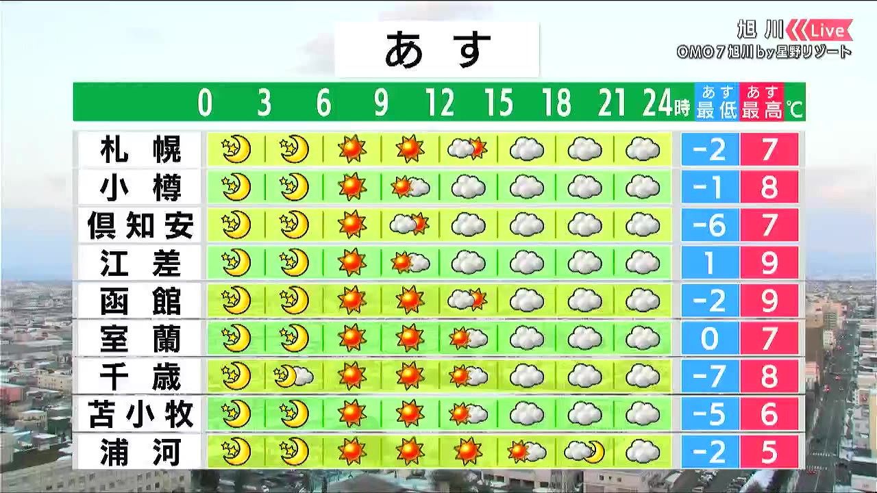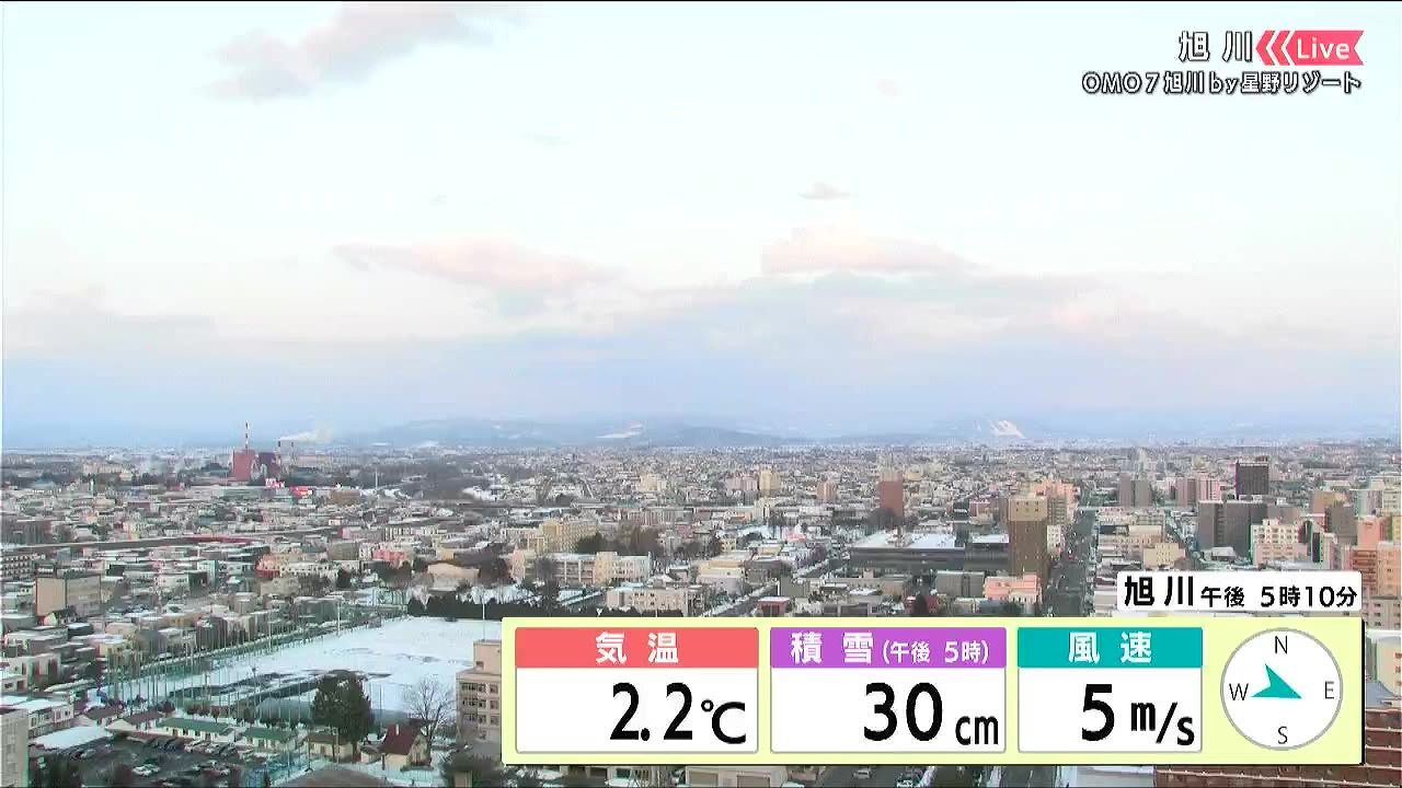 旭川は晴れていますが、昼頃は雪の強まる時間があり、変わりやすい天気でした。あす18日(水)は大気の状態が安定し、天気の崩れはないでしょう。