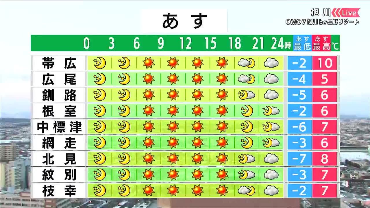 穏やかに晴れて、にわか雪もないでしょう。朝はこの時期らしい寒さで、広くマイナスです。日中は3月下旬から4月上旬並みの7度前後まで上がり、帯広は10度です。
