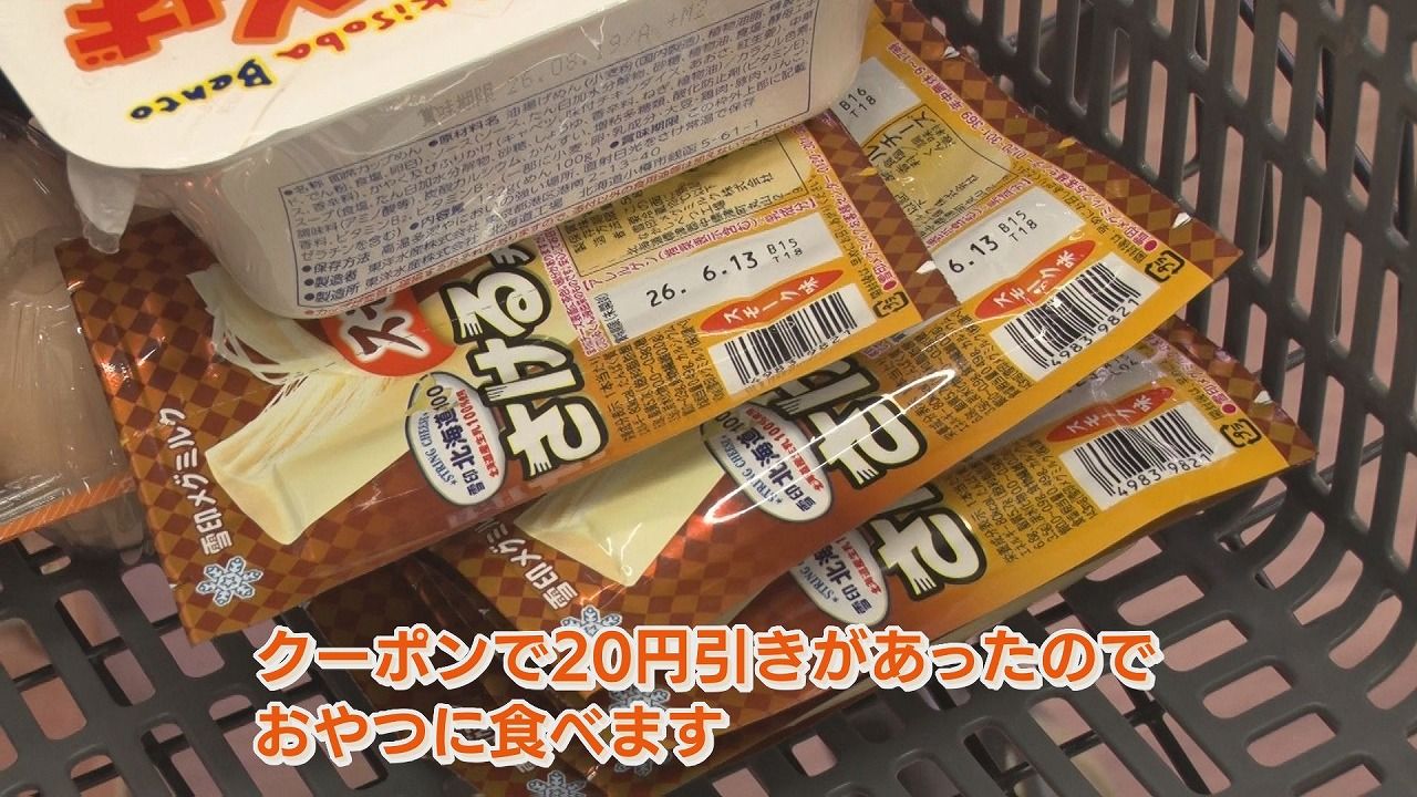 番組スタッフ:「チーズをたくさん買っていらっしゃいますね?」美紀さん:「クーポンで20円引きがあったので、おやつに食べます」