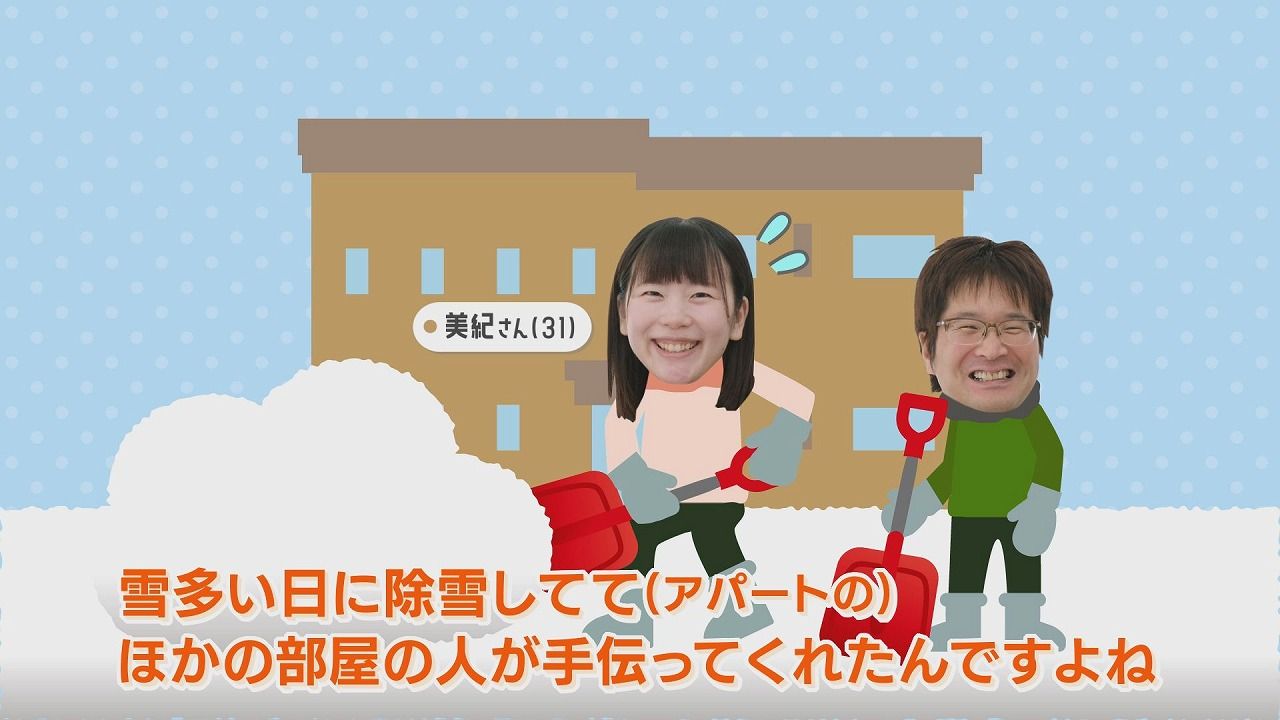 番組スタッフ:「夫とはどこで出会われたんですか?」美紀さん:「雪が多いときに除雪していて、アパートの他の部屋の人が手伝ってくれたんですよね。私、腰悪いので、痛がってやっていたら、手伝ってくれて。そうしたらちょっと世間話するようになって、仲良くなって…ってなって、結婚までいけたので」