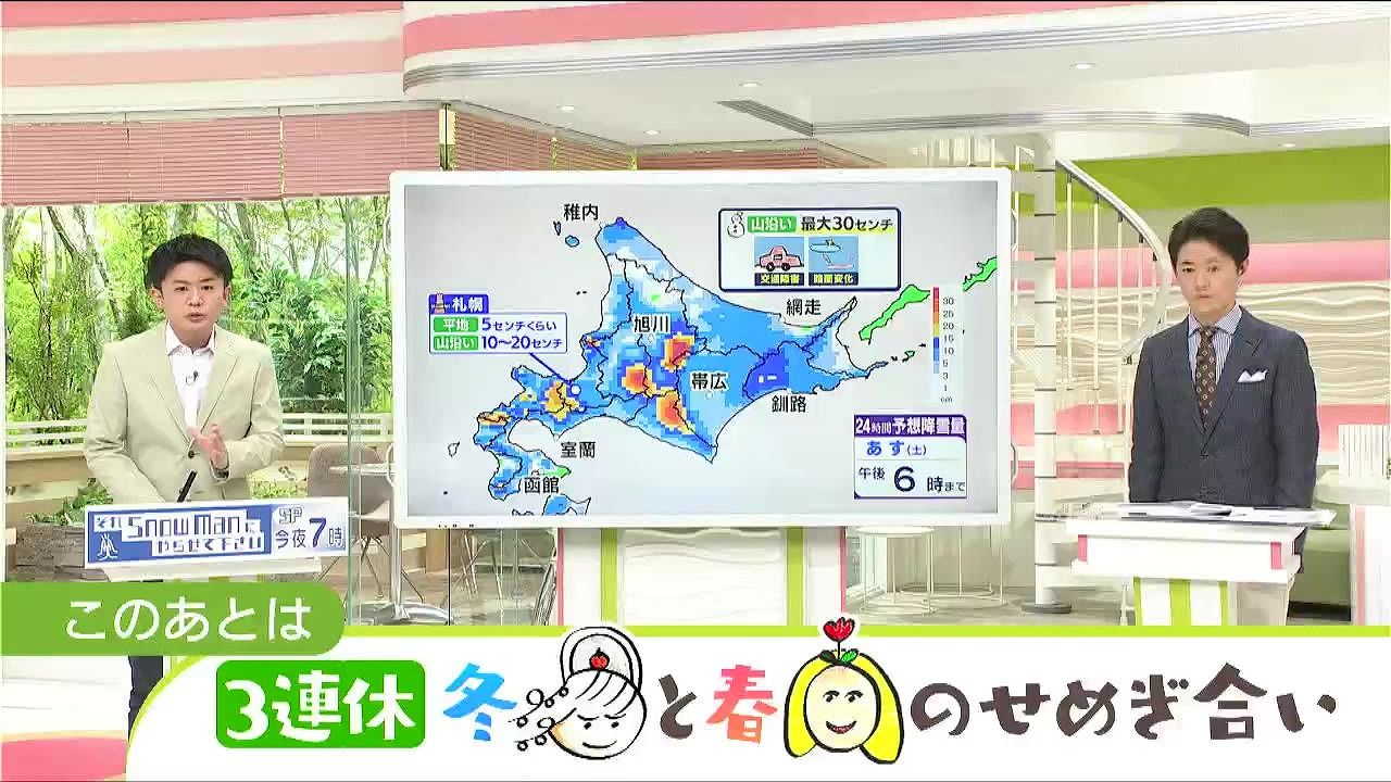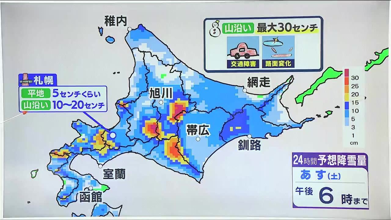 湿った雪が降り、朝から昼前にかけてはふぶくでしょう。降雪量は広く5センチ前後、山沿いや富良野周辺では局地的に20センチ前後です。午後はしだいに雪がやむでしょう。