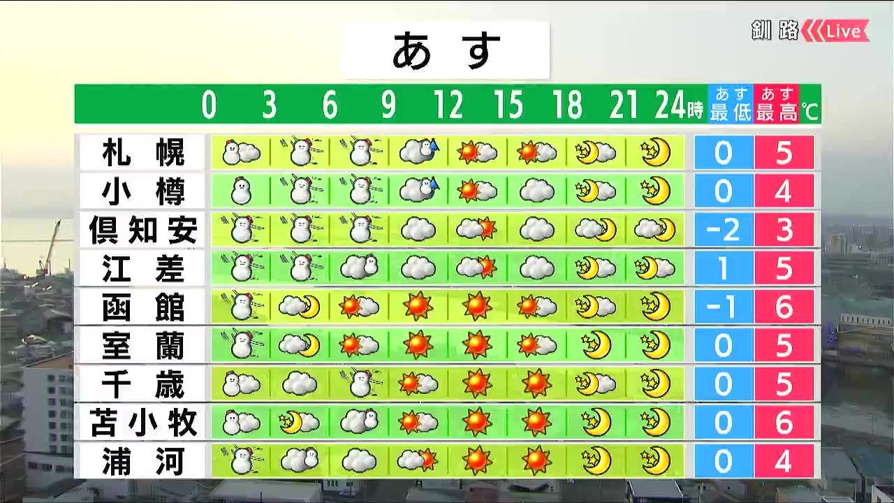 午前を中心に湿った雪が降るでしょう。大気の状態が不安定になるため、落雷や突風にも注意して下さい。最低気温はけさと同じ0度前後です。日中はきょうより低い4度くらいで風が冷たいでしょう。暖かい服装が必要です。