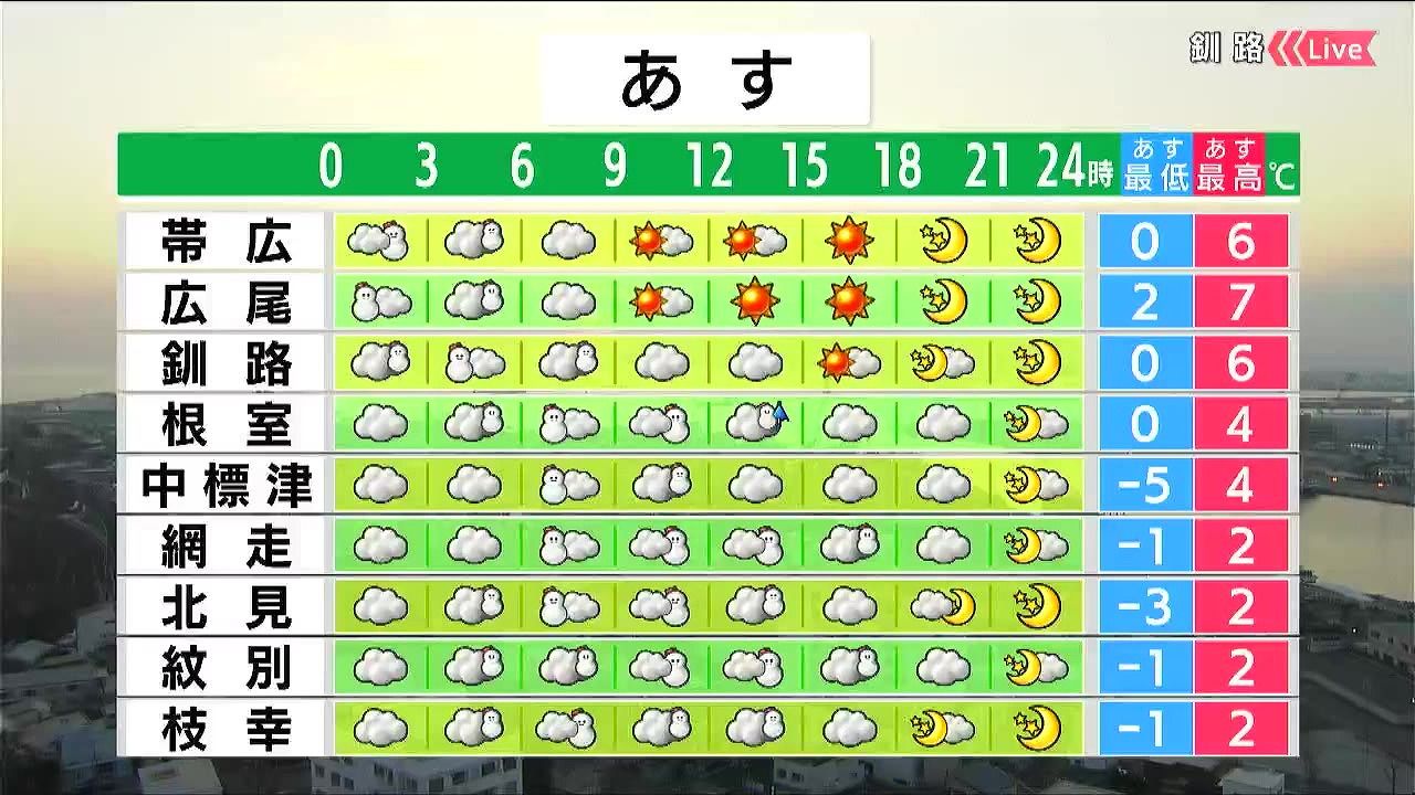 道東は午前を中心に、オホーツク海側は日中を中心に雪が降るでしょう。極端な大雪にはなりませんが、路面凍結などに注意して下さい。