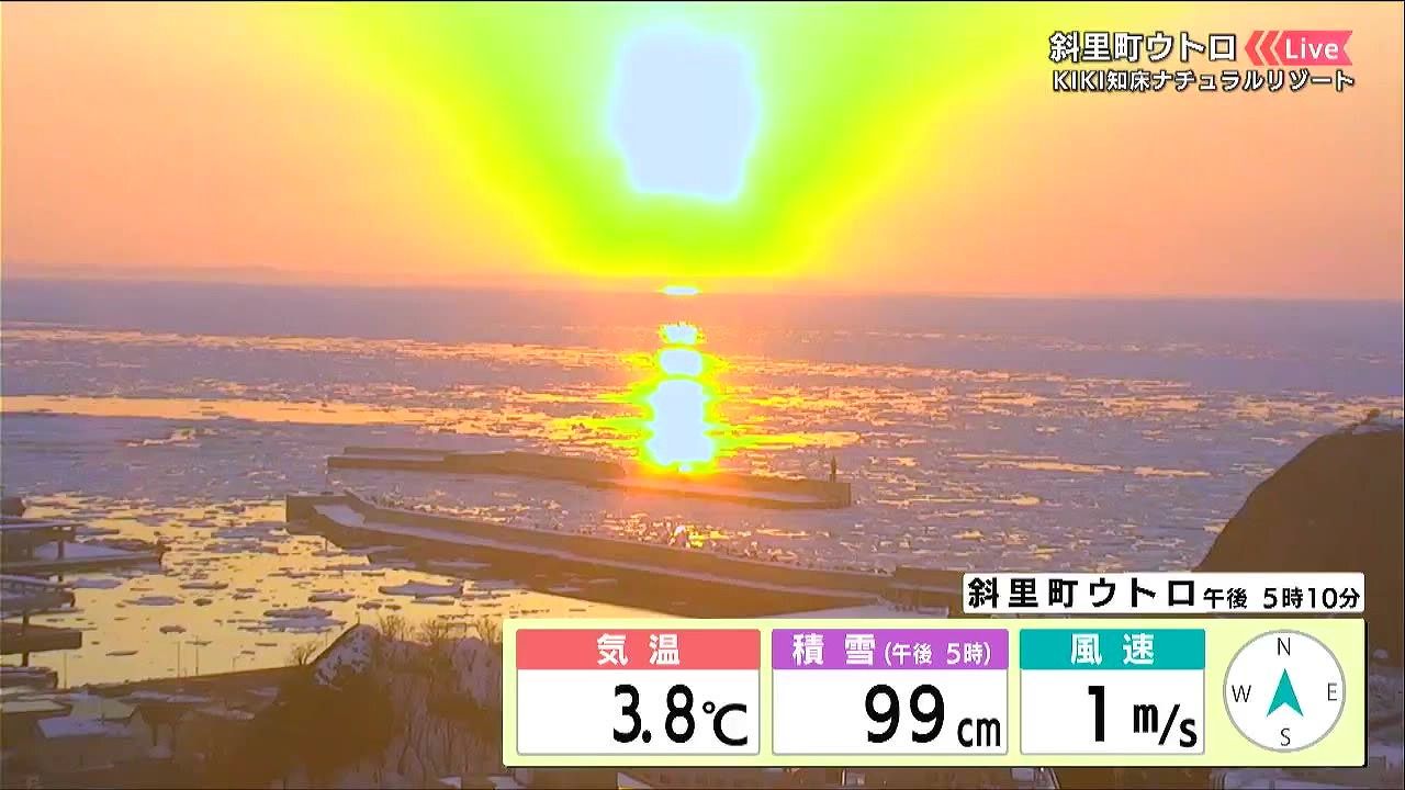 夕日と流氷の幻想的な景色もそろそろ見納めになりそうです。今後も気温は高めで、流氷は小さくなっていくでしょう。