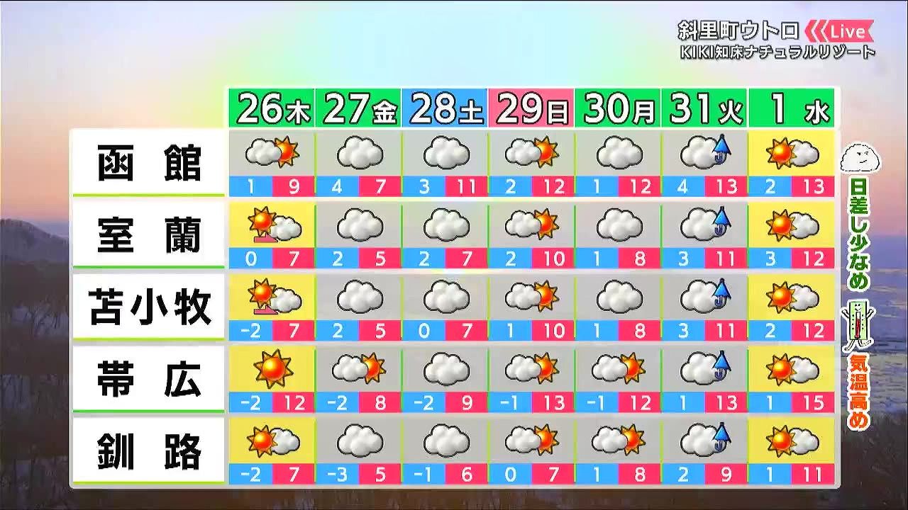 金曜日以降は雲が広がりますが、気温は高めで日中は10度前後です。山沿いでは雪どけが急速に進むため、なだれや川の増水などに注意して下さい。