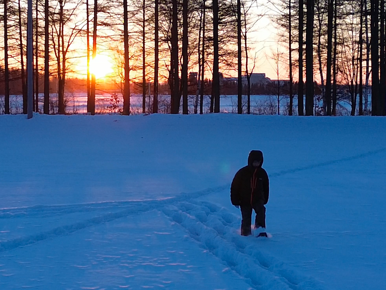 スノーシューを履き、広大な雪原を歩きながら足あとをつけ、たて100メートル横200メートルの雪原に「雪の結晶」を描きます。