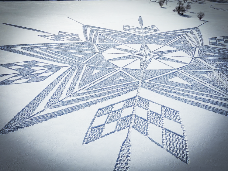 雪という自然のキャンバスに、人の足あとだけで描かれた1点限りの作品。