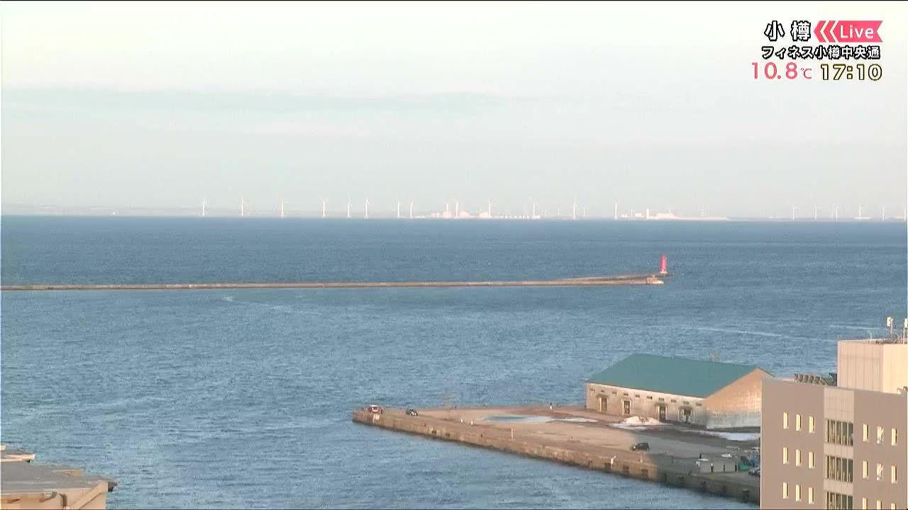小樽の空も明るく、海は穏やか。そして石狩湾の対岸の風力発電の風車も見えます。小樽はきょう26日(木)も穏やかで、最高気温は12.8度と、今年一番の暖かさになりました。あす27日(金)は日差し少なめ、気温は控えめです。