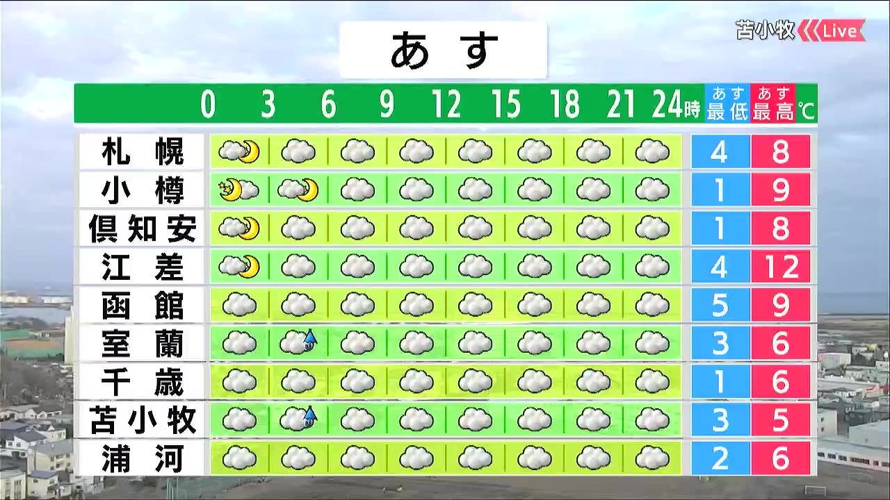 曇り空の一日です。室蘭や苫小牧では朝は小雨が降るため、念のため傘があると安心です。札幌や千歳はあすも南風が強まり、きょう26日(木)より空気がヒンヤリするでしょう。