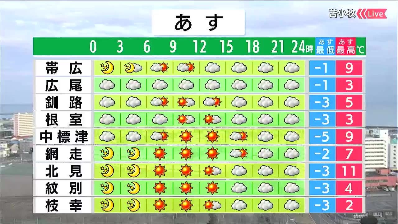広尾など太平洋側は雲が広がりますが、オホーツク海側は昼頃まで晴れるでしょう。最高気温は海岸部で5度くらいと、寒くなりそうです。