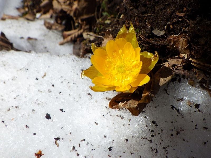 白と茶色しかないこの季節に、唯一と言っていいほど「色」を楽しませてくれるのが、春一番に開花するフクジュソウの黄色く輝く花たち。