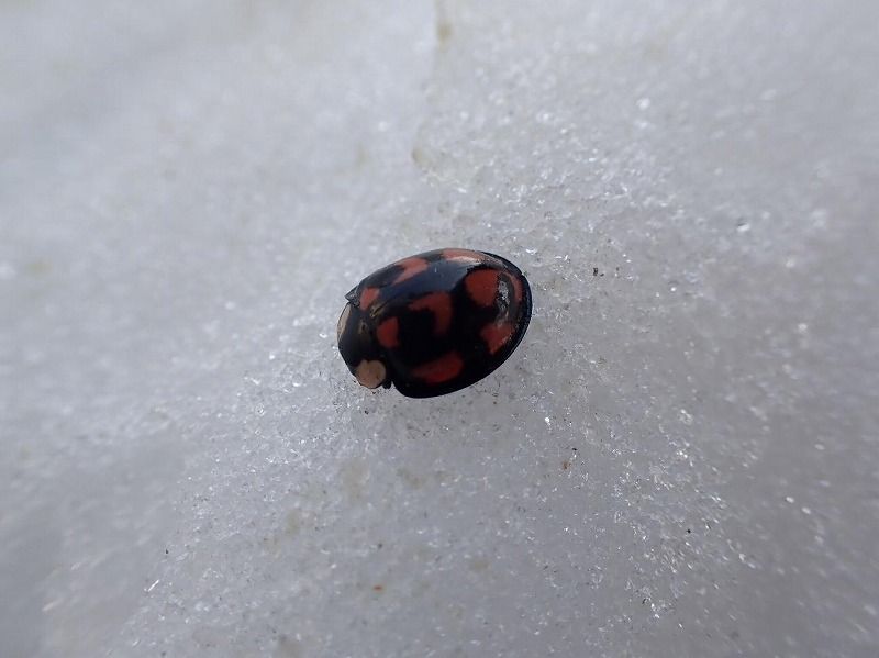 これはカメノコテントウという大型のテントウムシ。背景の白いものは雪。雪と昆虫はなかなか貴重な光景!