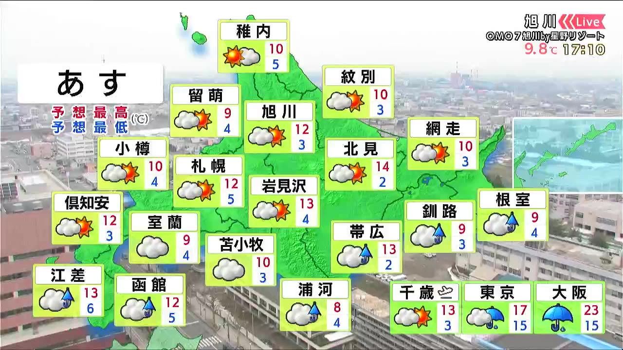 札幌や倶知安方面で薄日が差す程度で、雲に覆われます。太平洋側は霧がかかりやすく、夕方以降は函館や浦河などで弱い雨が降るでしょう。