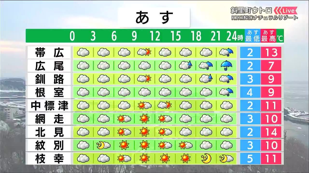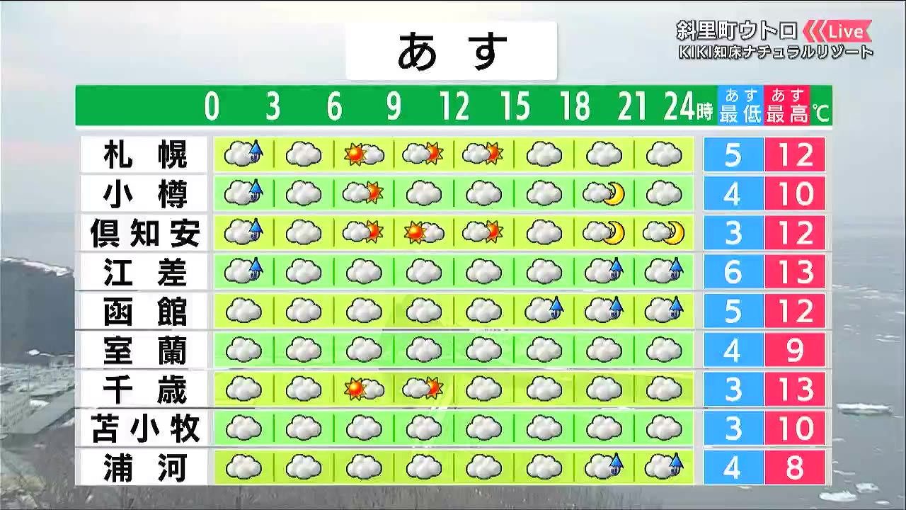太平洋側は低い雲や霧がかかり、夜は広尾や釧路などで雨が降るでしょう。オホーツク海側は晴れる見込みです。気温は高く、帯広13度、北見14度はともに4月下旬並みです。
