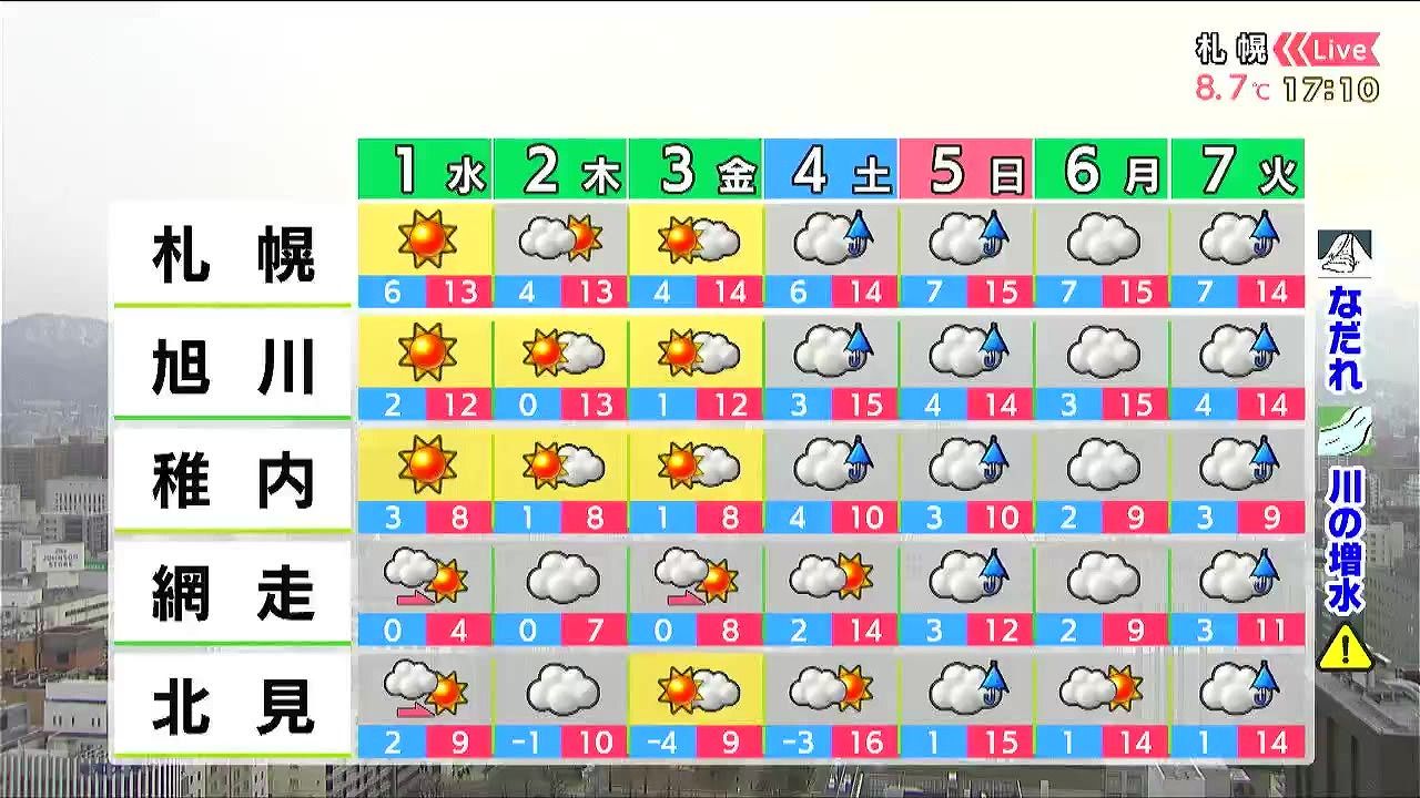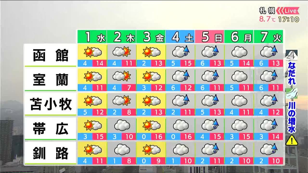 金曜まで広く晴れますが、土曜の午後から日曜は雨が降るでしょう。気温は高めで、山では雪どけが進みます。なだれや川の増水に注意して下さい。