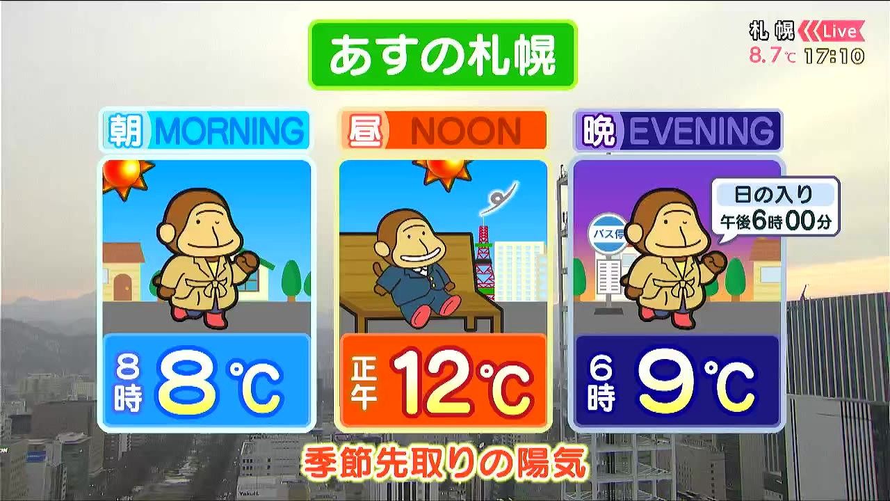 あす4月1日(水)の札幌です!朝昼晩の天気をもんすけでお伝えします!
