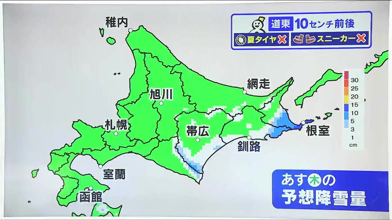 北海道の南に進む低気圧が寒気を引きずり込んで、道東で雪が降ります。根室方面など多いところは10センチくらいで、雪が積もりそうです。道東にお住まいの方、あす2日(木)は夏タイヤでの運転やスニーカーは避けた方がいいですよ。
