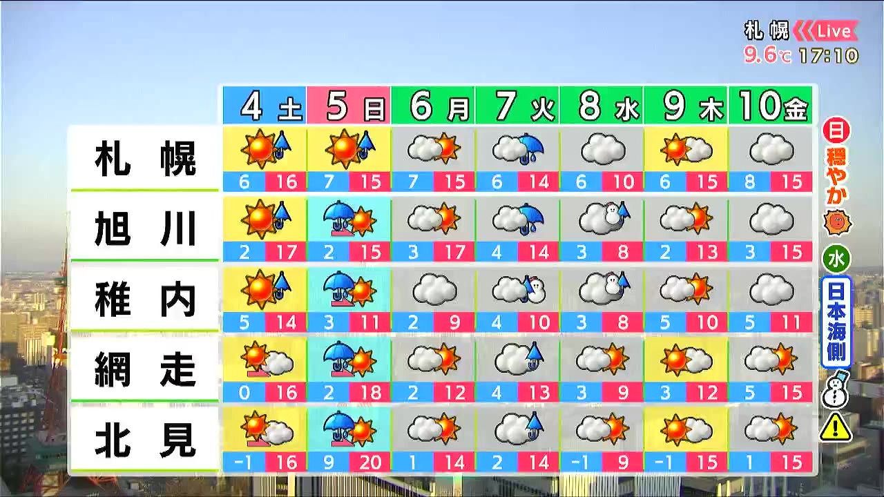 日曜の雨は朝までです。昼頃から穏やかに晴れて、北見は20度とポカポカ陽気です。来週は曇りで風の強まる日が多く、火曜の夜から水曜は日本海側で雪が降るでしょう。