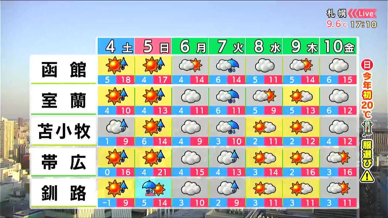 日曜の日中は晴れて、帯広の最高気温は21度。初夏の陽気です。ただ、朝晩との気温差に注意して下さい。来週は日差しが少ないですが、気温は高めでしょう。