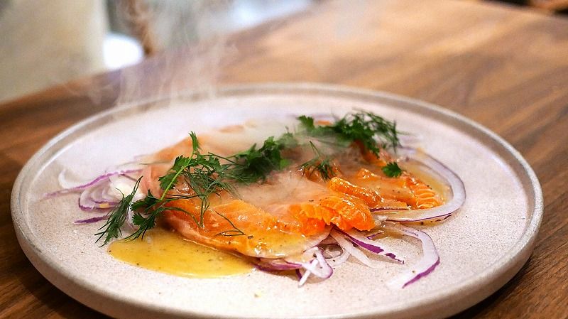 そしてこちらは、生サーモンのカルパッチョ~オレンジときのこ麹のドレッシング。