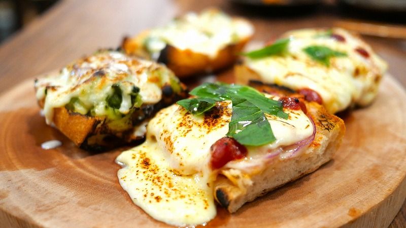 自家製のケチャップと5種類のチーズをバゲットにのせて焼くパン屋のピザは、2ピースからオーダー可能。野沢菜とブルーチーズのピザ、飲まさりました~
