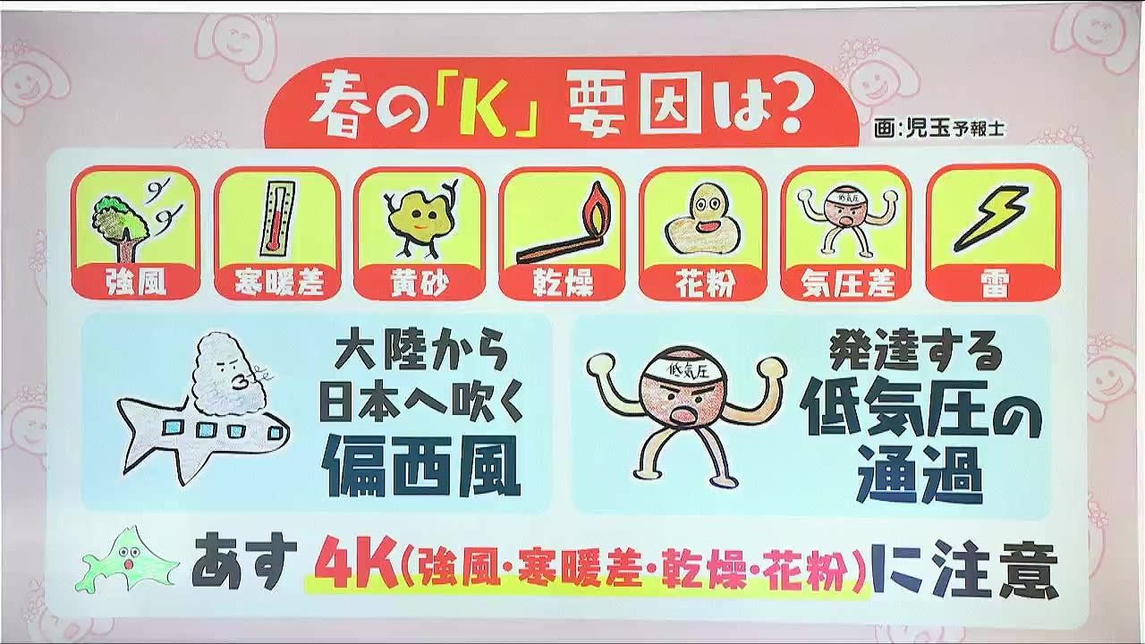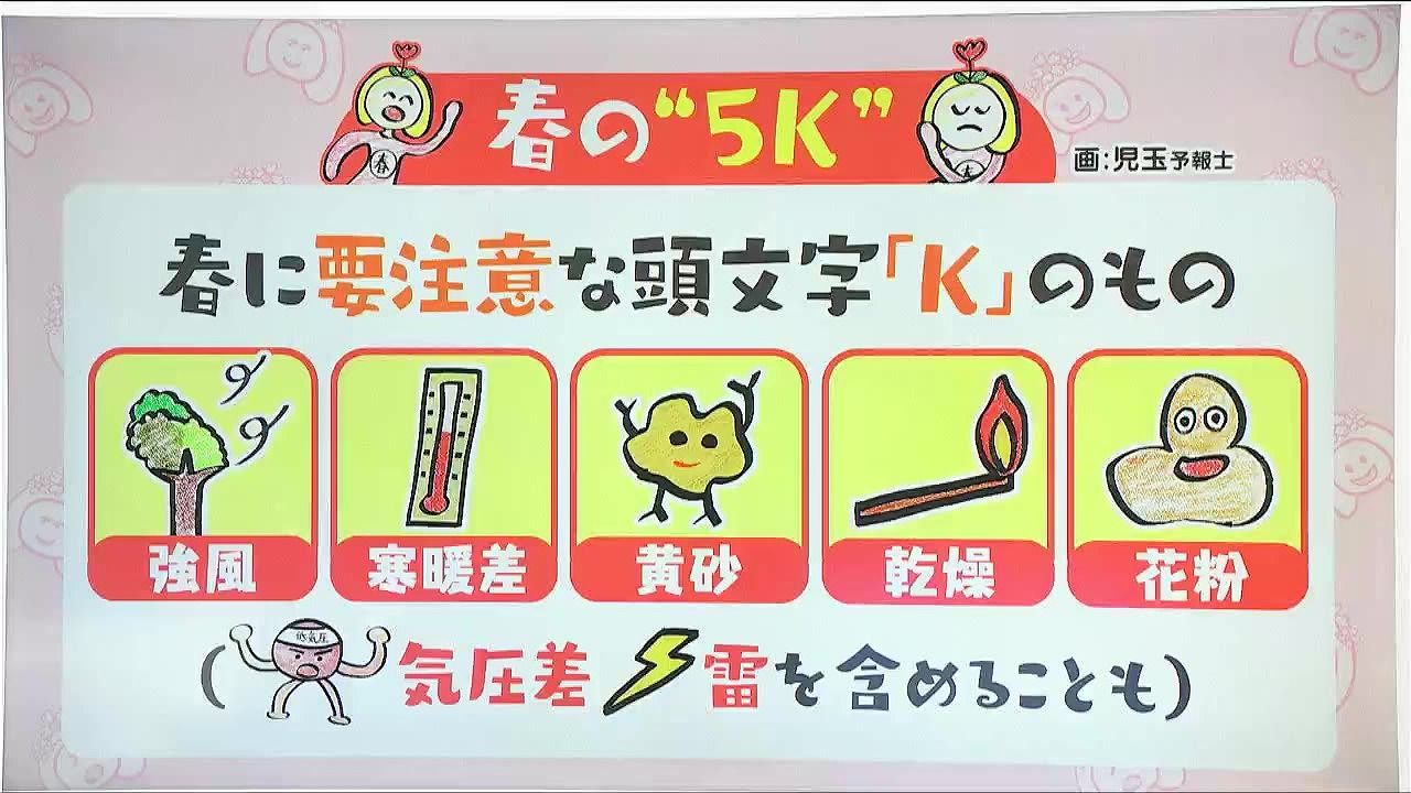 「春の5K」、聞いたことある人も多いと思います。春に注意が必要な頭文字「K」のもの、強風、寒暖差、黄砂、乾燥、花粉です。近年では、気圧差や雷も含めて6K、7Kと言われることもあるようです。