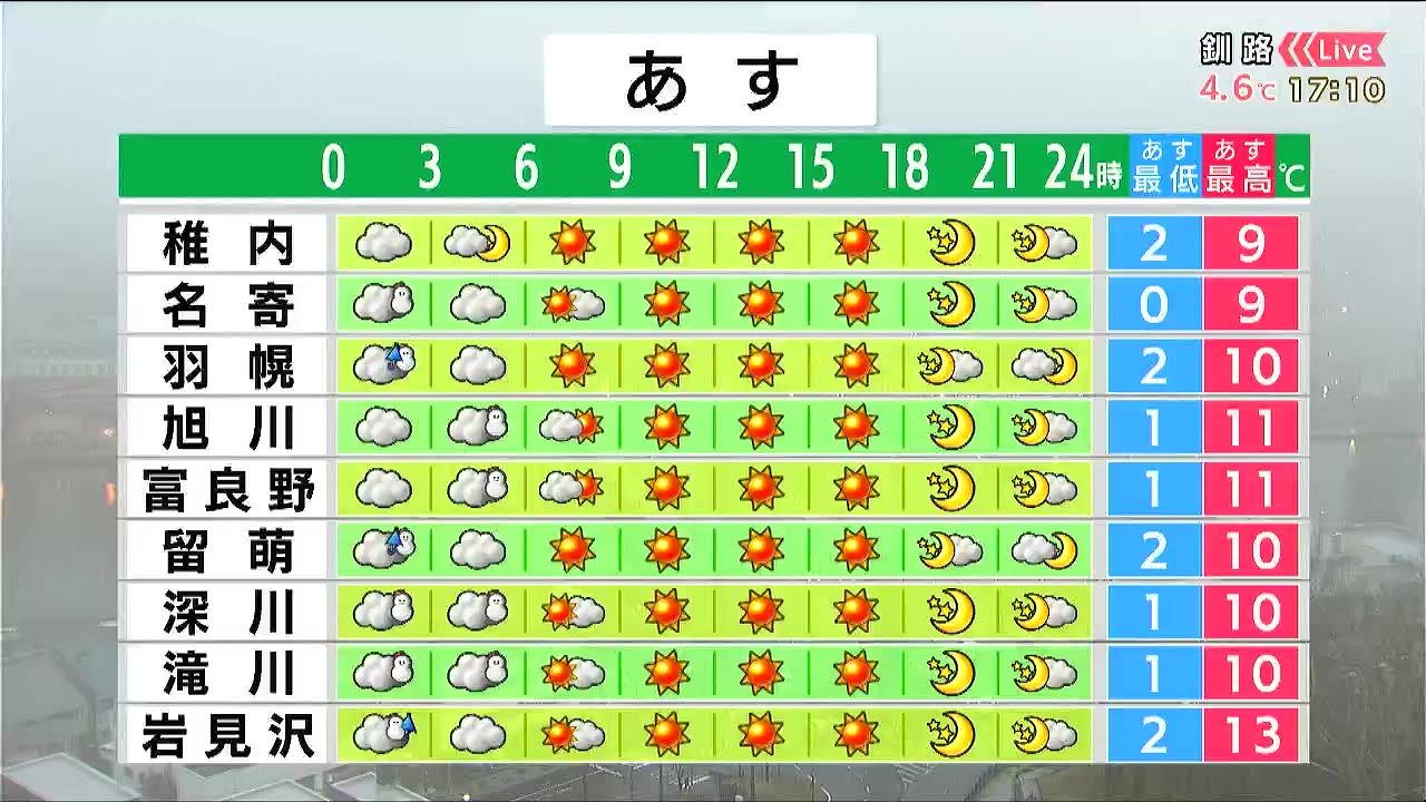 旭川や滝川など内陸で明け方まで湿った雪が降るでしょう。その後は晴れますが、内陸でも風が強まりそうです。